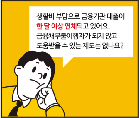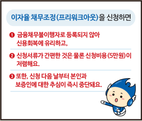 실직, 사업파탄 또는 그로 인한 3개월 이상의 연체 등으로 소득이 부족한 경우빚을 갚는데 어려움을 겪고 있다면 채무조정제도(개인운동)를 이용하여 도움을 받을 수 있습니다. 채무조정(개인운동)의 경우 신청서류가 간단하고 신청비도 50,000원으로 매우 저렴합니다. 이 시스템을 사용할 때 신청 익일부터 본인 및 보증인의 추심은 즉시 정지되며, 신용조회 신고서의 공법상 정보는 성실상환(2년 이상) 시 조기 삭제됩니다.학점회수에 매우 유리한 제도입니다.