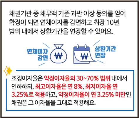 또한 채무조정이 완료되면 이자(연체이자)는 감면 또는 면제되며 원금잔액은 상각 여부에 따라 0~70%, 사회적 약자의 경우 최대 90%까지 감액된다.받을 수 있습니다.