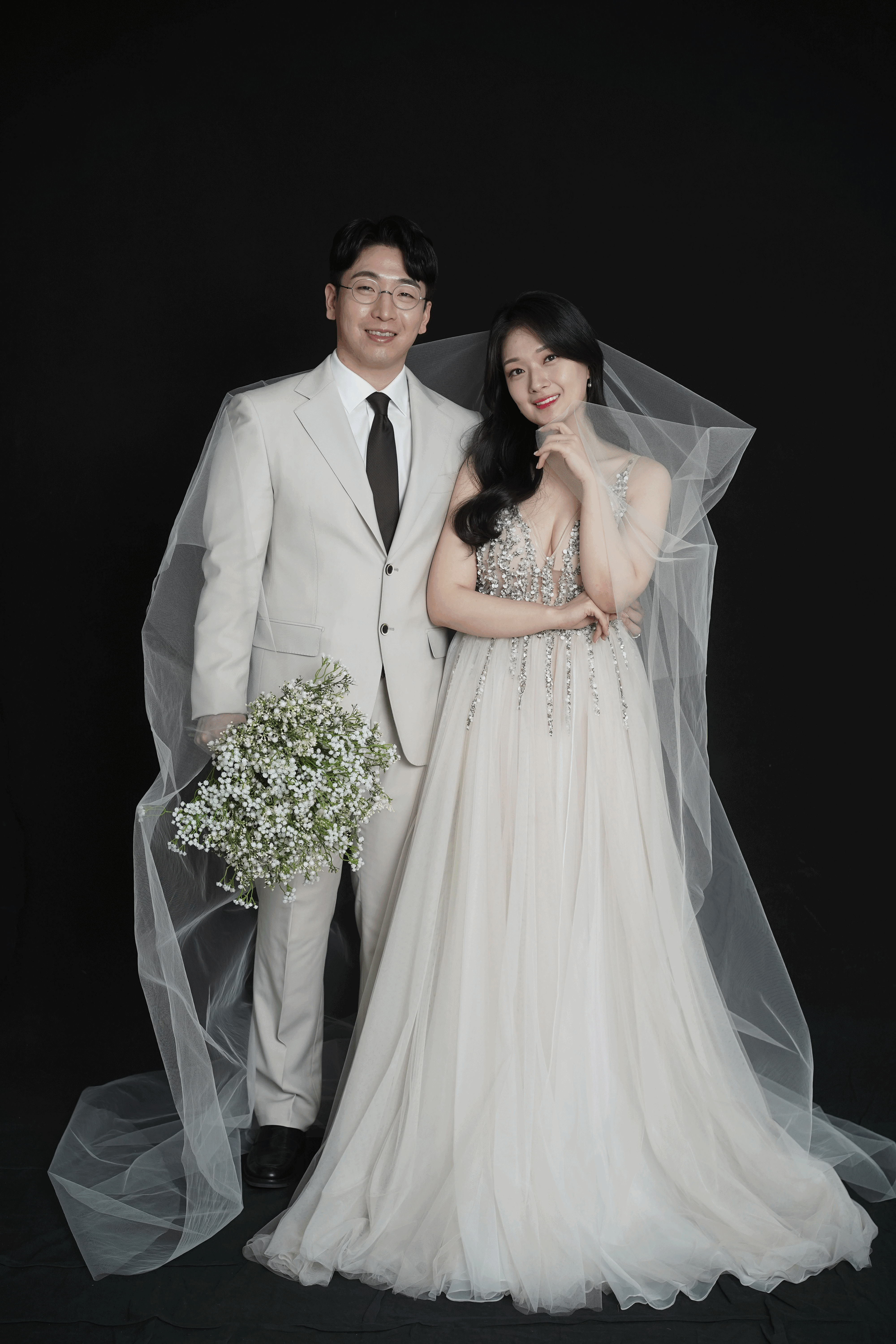 검은 배경의 아름다운 웨딩 사진입니다.