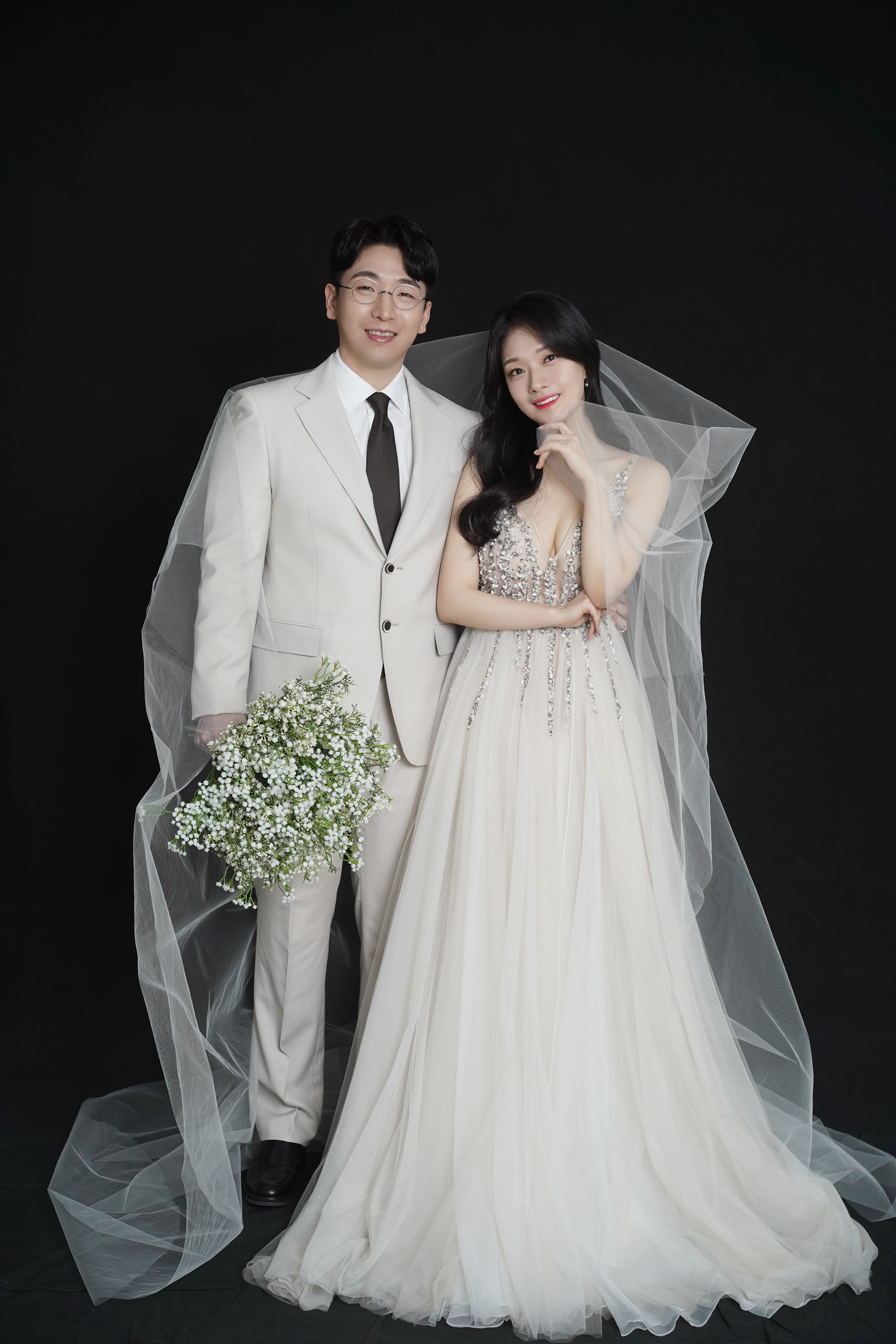 검은 배경의 아름다운 웨딩 사진입니다.