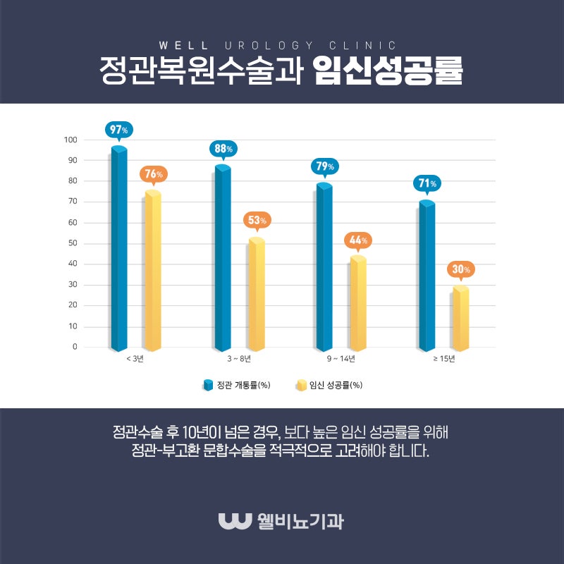 정관수술 후 임기 성공률은 3년 내 97%, 3-8년 내 71-88%, 9-14년 내 44-79%, 15년 이상 내 30-71%